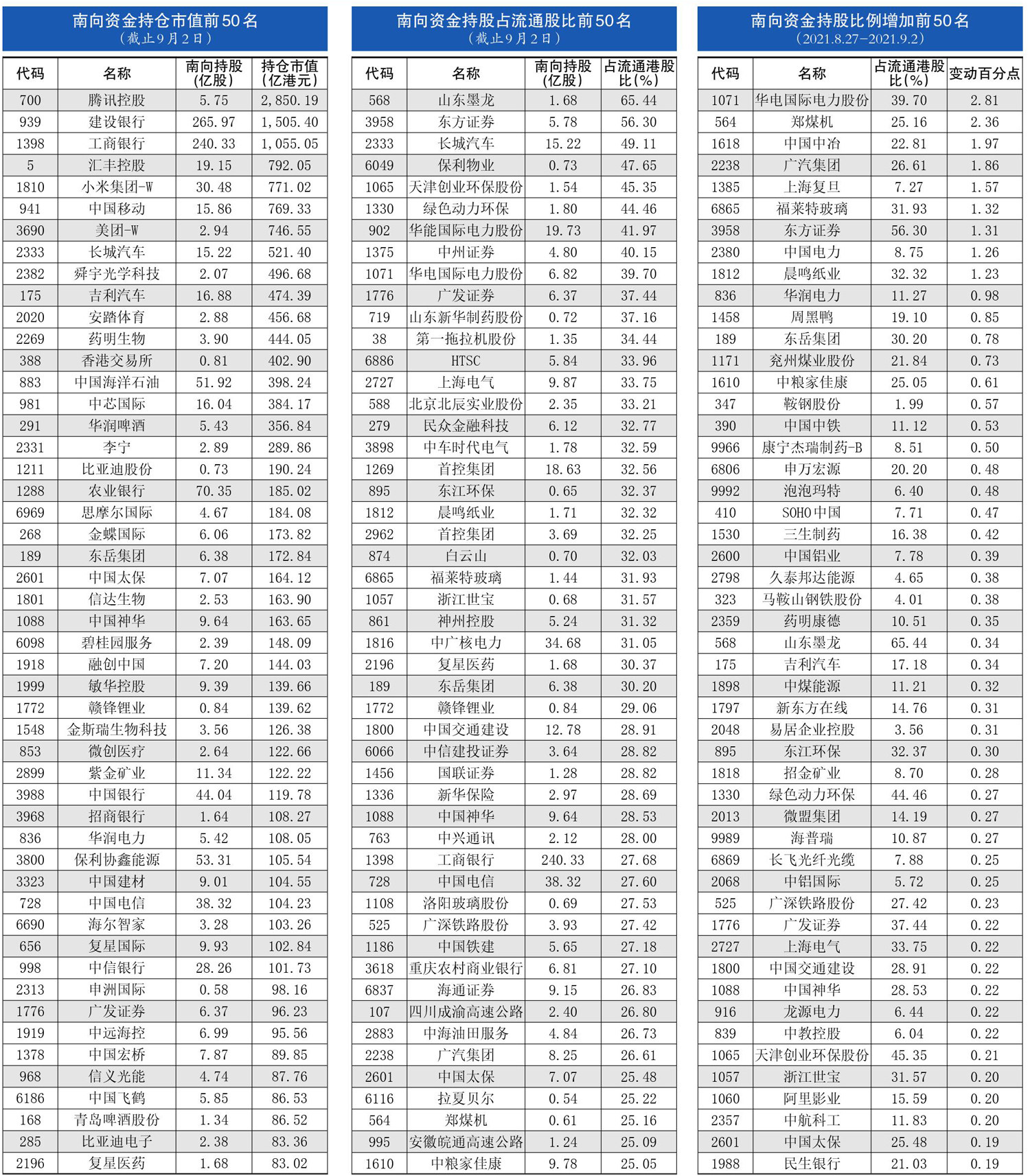 南下资金持仓、持股变动