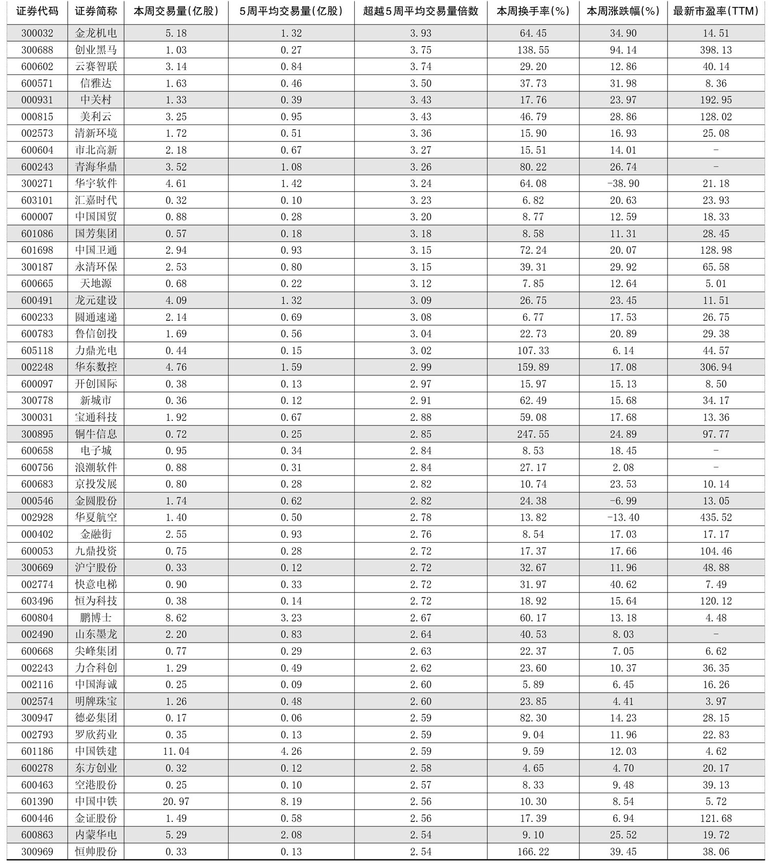 一周成交量大幅增加前50只个股