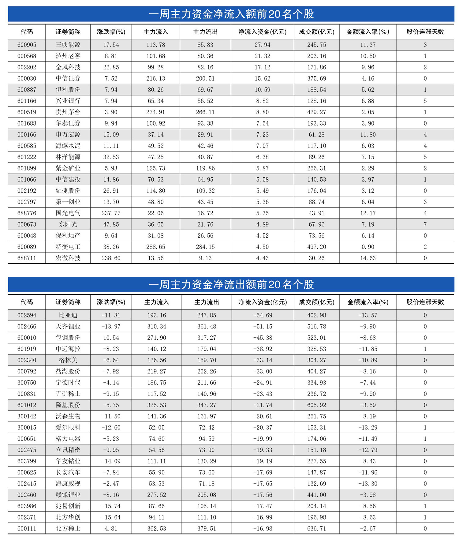一周资金净流入(出)额前20名