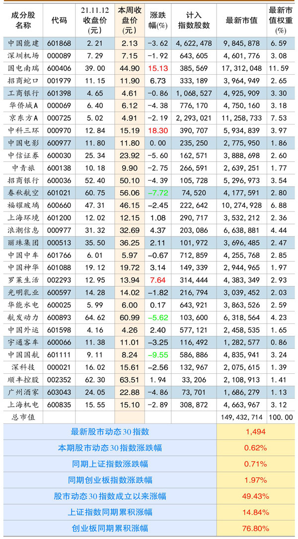 本期股市动态30指数收于1494点,较上期上涨0.62%,同期上证指数上涨0.71%,创业板指上涨1.97%。股市动态30指数成立以来上涨49.43%,同期上证指数上涨14.84%,创业板指上涨76.8%。成分股中科三环、国电南瑞、罗莱生活等个股涨幅靠前,中国国航、春秋航空、航发动力等个股跌幅居前。 本期成分股重大事项及评论: 中科三环(000970):公司近期在接待投资者调研时披露,公司计划