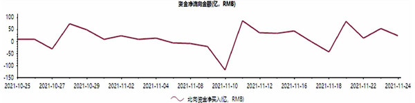 北向资金净流向图(2021年10月25日-11月24日) 数据来源:东方财富Choice 北向资金前20大活跃个股(2021年11月18日-11月24日) 注:成交占比指区间内陆股通成交金额占总成交金额的比例 数据来源:东方财富Choice