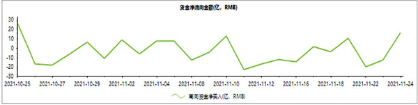 本统计期内(11月18日至11月24日),A股在3550点左右震荡,市场结构性轮转明显,权重和题材呈现出跷跷板状态,震荡式上扬结构保持良好。 从行业资金流向看,本期有色金属、食品饮料、采掘行业呈现净流入状态,金额为47.34亿元、30.31亿元、15.23亿元。电气设备、医药生物、电子等行业净流出居前,金额分别为191.26亿元、148.61亿元、113.97亿元。 个股方面,除去停牌股票,净