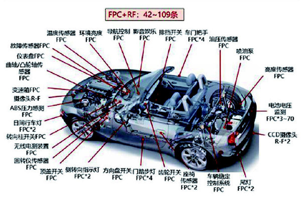 FPC全称是柔性电路板,它是以柔性覆铜板为基材制成的一种电路板,作为信号传输的媒介应用于电子产品的连接。过去FPC的增长主要来自消费电子行业,由于具备配线组装密度高、弯折性好、轻量化、工艺灵活等特点,符合下游电子行业智能化、便携化和轻薄化,2009年-2019年FPC产值不断增加。未来随着产业增长动能切换,电动化将是FPC需求最大的驱动力。 车载FPC需求大 过去FPC主要驱动力在消费电子,受