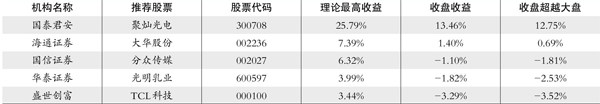 上期荐股排名(2021年11月15日-2021年11月26日) 累计排名 收盘收益=(本期收盘价-上期收盘价)/上期收盘价。 本期累计收益率=(1+上期累计收益率)*(1+本期收益率)-1。 大盘表现:1、当期大盘表现为上证指数两周涨跌:2、累计大盘表现为截止当期末上证指数年内涨跌。 编辑笔记 年底行情不确定性加大。 上周荐股第一名 国泰君安收盘收益:13.46% 聚灿光