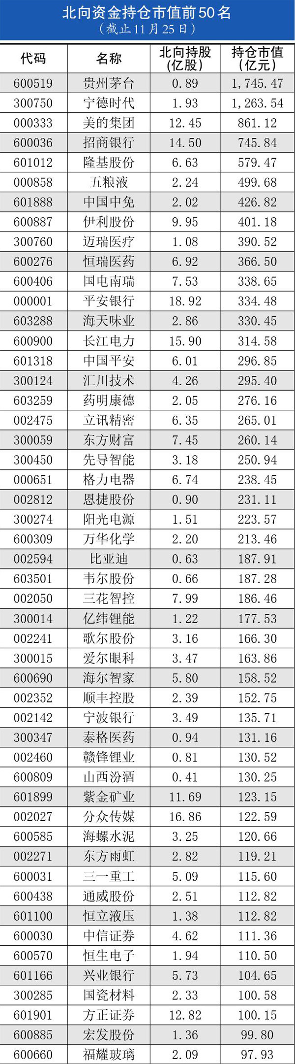 北向资金持仓、持股变动