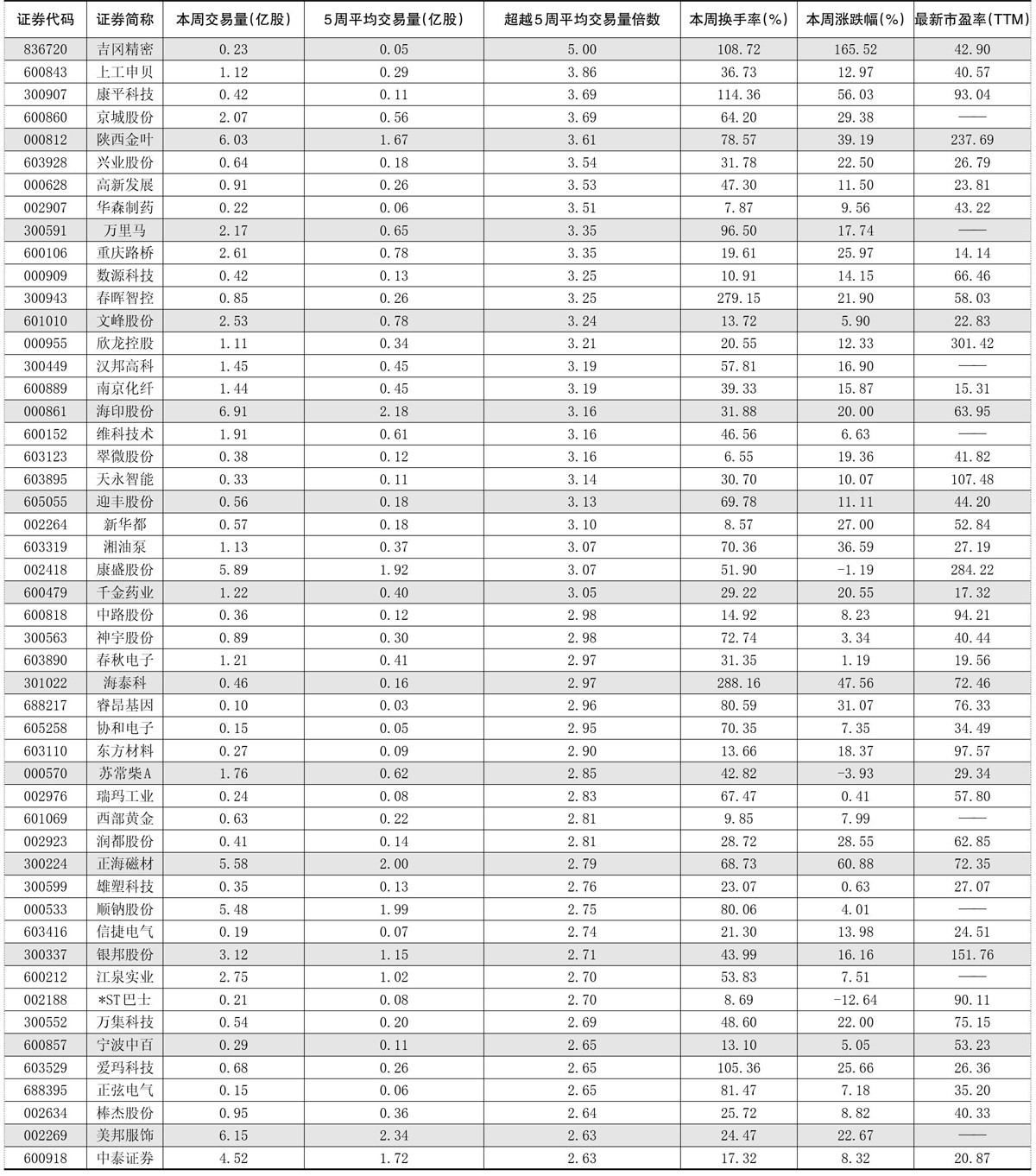 一周成交量大幅增加前50只个股