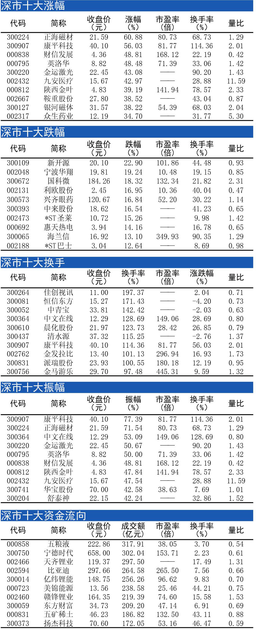 十大涨跌幅、换手、振幅、资金流向