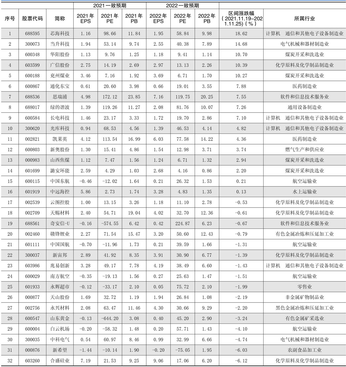 分析师一分致析预师期一大致幅预调期高大个幅股调(统高计截个止股日:2021-11-25) (数据来源:东方财富choice) 1、本数据系在近1个月内,调整幅度大于10%、预测机构数大于7家、一致预期不断调高的股票。 2、一致预期EPS(每股收益):近3月内,机构影响力和发布时间影响力双重加权计算。