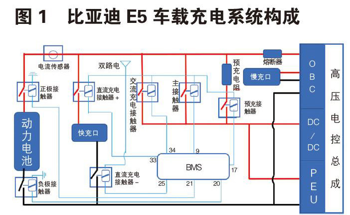 摘 要:随着《新能源汽车产业发展规划(2021-2035年)》等相关文件的出台,进一步表明国家对加速发展电动汽车这一行业的决心,充电系统是电动汽车核心技术之一,它能够把外部的电能通过化学反应的方式储存在电池内部,以备车辆使用,而往往充电时间主要取决于充电机功率的大小,功率越大充电时间越短反之俞长。本文主要以比亚迪E5车型为对象,分别从充电系统的构成、充电枪电子锁、慢充控制策略、充电失效几个方面进行