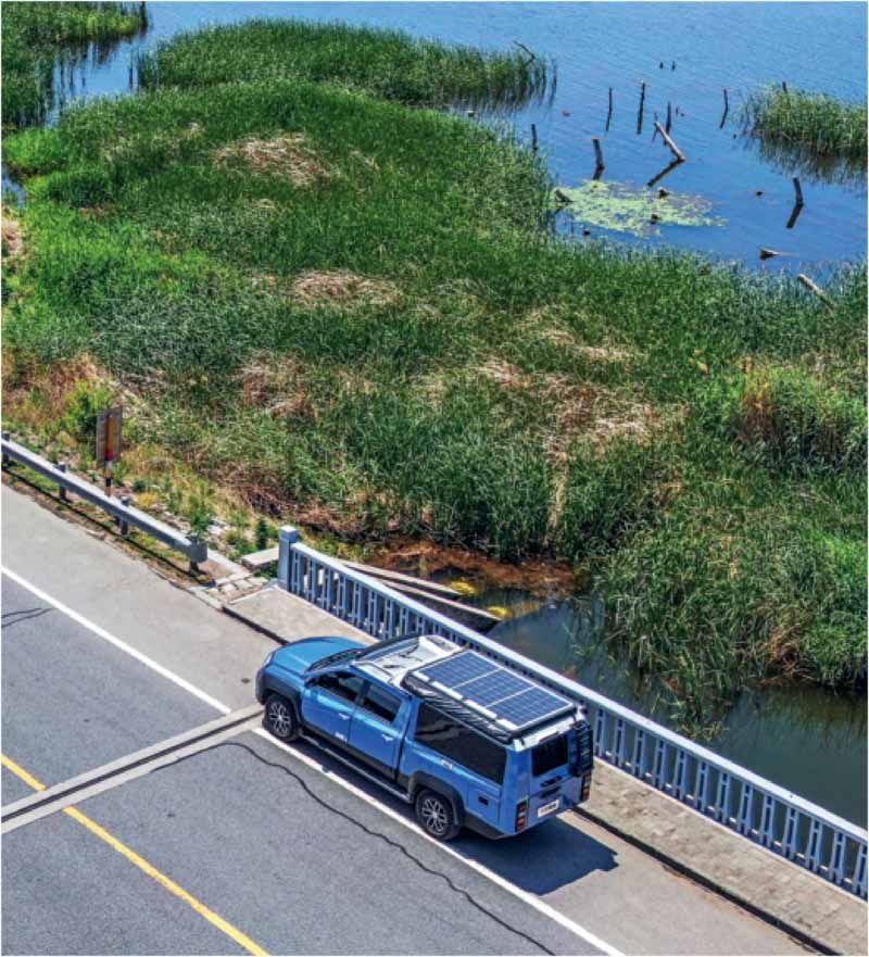 左手垂钓玩得专业 其实从外形上,已经很难看出域虎钓鱼版和皮卡车型之间的关系了,它看起来更像一个房车,甚至有些像特种部队的军方保障车,方方正正的车厢厢体搭配上两侧的展翼飘窗和后部的攀爬楼梯,整个车型看起来就是功能性十足。但它在路上行驶着,你还真摸不透它能有什么独门秘籍。 我们迫不及待地找到一片场地将域虎钓鱼版停妥,就像变魔术一样一点一点发掘它的乐趣。整个车辆的左侧设计成了垂钓功能区,打开上翻