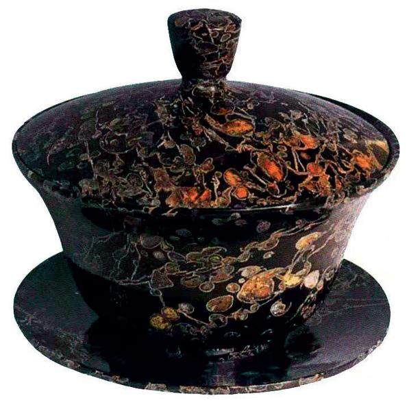 家藏古代茶器数盏,宋代油滴盏当为珍品。我多年千淘万漉得来的这些收藏品中,称作奇绝的是一件清代梅花玉茶盏。若入一盏清茶,托盏而饮,那温润奇特的古代梅花玉盏杯中,便有悠悠茶香自遥远的时空袅袅飘来。 这件清代梅花玉茶盏,高7.2厘米,宽6.5厘米。下有底盘,上有圆盖。整个盏面,黛青的底色上布满了绛紫色连枝梅花。形状天然的梅,疏影浓淡相宜,清逸飘洒自如,好一幅上天赐予的美奂佳图,可谓天功神奇,想象无