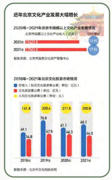 近年来,北京坚持“科技为文化赋能、文化为城市赋能”,立足全国文化中心,持续推进文化产业发展引领区建设,文化产业高质量发展取得新成效。中国人民大学文化产业发展研究院发布 “2021中国省市文化产业发展指数”显示,北京连续六年在中国省市文化产业发展综合指数排名中保持第一。 2020年,全市文化及相关产业实现增加值3770.2亿元,占地区生产总值的比重为10.5%,始终居于全国首位。2021年,北京规