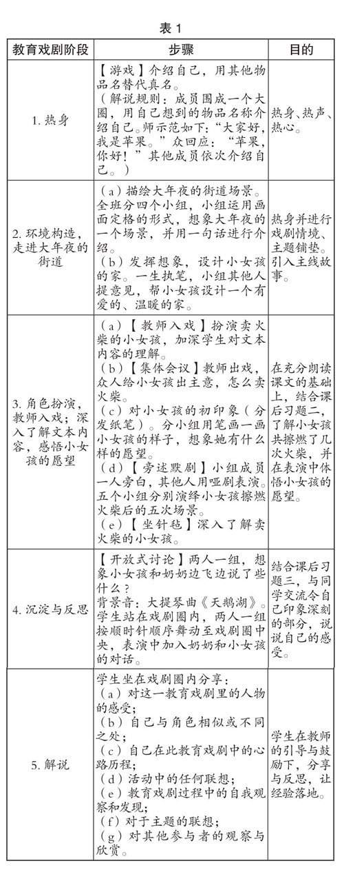 【摘要】文章以三年级上册的《卖火柴的小女孩》童话课为例,将“旁述默剧”“集体会议”“坐针毡”“开放式讨论”等戏剧范式与课堂教学结合起来有效应用,并采用教育戏剧对课文重构进行教学设计,使得小学低段的语文课堂更加活泼生动,培养学生独立思考的能力,激发学生学习语文的兴趣。 【关键词】教育戏剧;童话教学;戏剧范式 【基金项目】黄埔区教育科学“十三五”规划2019年面上一般课题,“基于课堂即兴微剧的活化