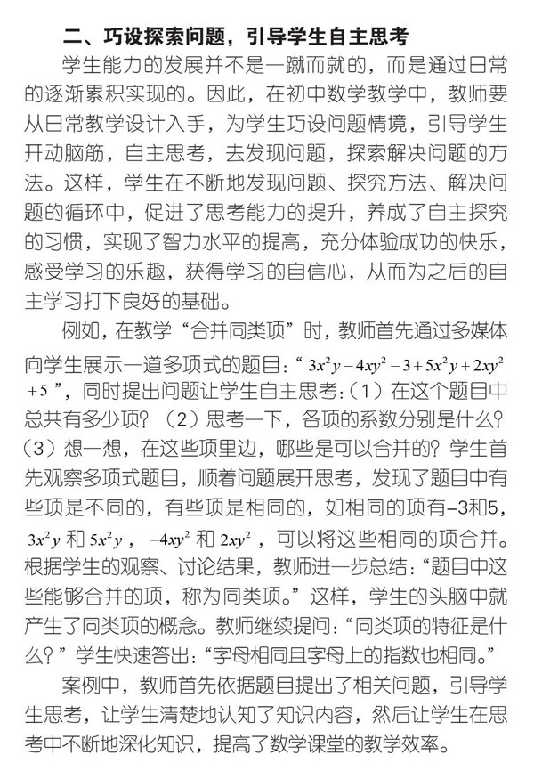 【摘要】教育的最终目的是让学生学会自主学习。自主学习可以让学生在实践和质疑中获得独立分析和处理信息的能力,提高学生的探索水平,使学生获取相应的知识。因此,在初中数学教学中,教师要从根本上改变学生的学习状态,将学生培养为自主学习者,让数学课堂熠熠生辉。 【关键词】自主学习;初中数学;合作探究 在传统的数学教学中,教师多采用满堂灌的形式展开教学,学生只能被动地接受知识,缺乏对知识进行自主思考的过程