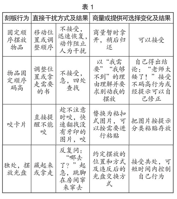【摘要】刻板行为是自闭症的核心障碍之一,它的出现对自闭症及其家庭都会造成众多负面的影响,同时给与之相处的教师、身边的人带来很大的挑战[1]。研究发现,依自闭症刻板行为特质通过合理设计并使其自然接受的生活技能操作程序进行学习指导,能有效提升自闭症的居家生活能力。 【关键词】自闭症;刻板行为;编程输入;生活能力 【基金项目】本文为北京市“十三五”教育科学规划2019一般课题,题目名称“依托‘家长喘