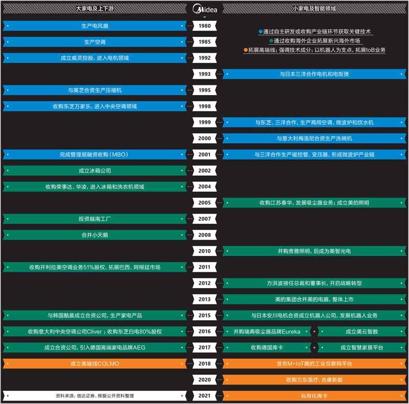 美的业务版图扩张历史 2020年11月,在海南三亚,美的董事长兼总裁方洪波看着海面上的帆船,有感而发:“美的要做世界级的水手。”海面波涛汹涌,正是水手展示技巧的时候。 这一细节出自《证券时报》2021年2月一则报道,此后,方洪波所言的行业的“波涛汹涌”仍在持续,但2021年美的确实做了几件大事。 一是更新经营战略,将原有的四大业务重组为智能家居事业群、机电事业群、暖通与楼宇事业部、机器