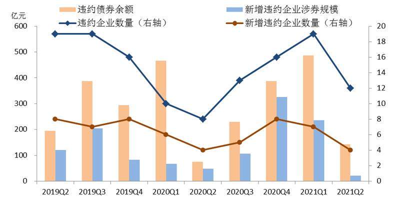 2021年上半年违约总体情况与2020年下半年基本持平,但新增违约有所减少。上半年,中国债券市场累计有26家企业(含4家上市公司)的60只债券出现违约,其中15家民企(含3家上市公司)、2家中央国有企业、8家地方国有企业,违约企业数量较去年下半年增加1家。违约涉及债券规模总计约628亿元,与2020年下半年基本持平。新增违约企业11家,较2020年下半年减少3家,违约涉券规模257亿元,较2020