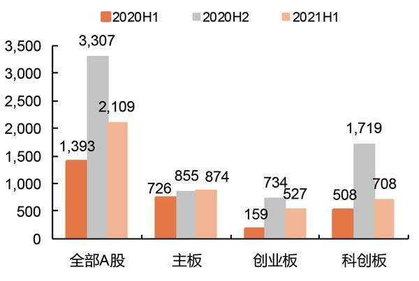 上半年,受压实中介机构责任、强化股东信披监管及强调科创板“硬科技”属性等因素的影响,IPO撤单公司数量大幅增加,导致真实通过率下滑。与2020年上半年相比,IPO融资规模虽然有所增加,但与2020年下半年相比则有所萎缩。 回顾上半年的数据可以发现,强监管对IPO融资规模还是有不小的影响,上半年IPO融资规模同比、环比增速均出现分化,创业板及科创板融资规模下滑。数据显示,上半年,A股IPO融资规模