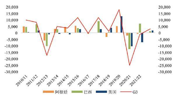 油籽与蛋白市场方面,全球大豆库存开始累积,此前供需不匹配导致的库存下降已经出现根本的改变。从全球主要大豆产区供需来看,2021/22年度,G3国家大豆库存开始边际恢复,由于美国大豆库存高于预期,因此恢复速度要快于此前市场预估的节奏。本轮大豆牛市的高点位置在中长期将成为重要的压力位,只要新季南美产量不出现问题,前期高点已经难以达到,长期的价格走势是向下的,中短期价格运行的季节性会更加明显。 油脂市