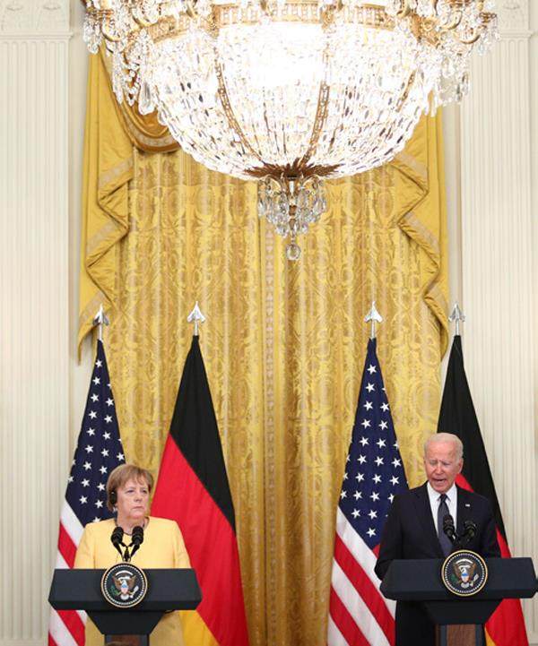 2021年7月15日,德国总理默克尔访问美国。图为其与拜登在华盛顿举行联合新闻发布会。 拜登就任美国总统后德美关系迅速回暖,逐步回归盟友“常态”,成为跨大西洋合作重启的重要标志。德美关系的新变化反映出当前形势下两国对外战略的新考量,折射出德国国内政治演变的新态势。2021年9月,德国举行新一届联邦议院选举,正式开启“后默克尔时代”,并由此翻开德国和欧洲政治的新篇章。在此背景下,德美两国拉响了“后