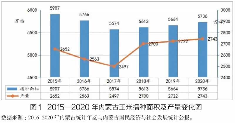 一、内蒙古玉米产业基本情况 内蒙古是我国主要的玉米种植区,近年来,玉米种植面积一直稳定在5000万亩以上。自2016年国家实行玉米收储制度改革和镰刀弯地区(东北冷凉区、北方农牧交错区、西北风沙干旱区)玉米种植结构调整政策起,内蒙古非优势区玉米播种面积连续两年调减,玉米种植不断向优势产区集中。2018年以来,玉米的需求量稳定增长,伴随着玉米价格上涨及畜牧业和玉米深加工产业的快速发展,内蒙古玉米播种