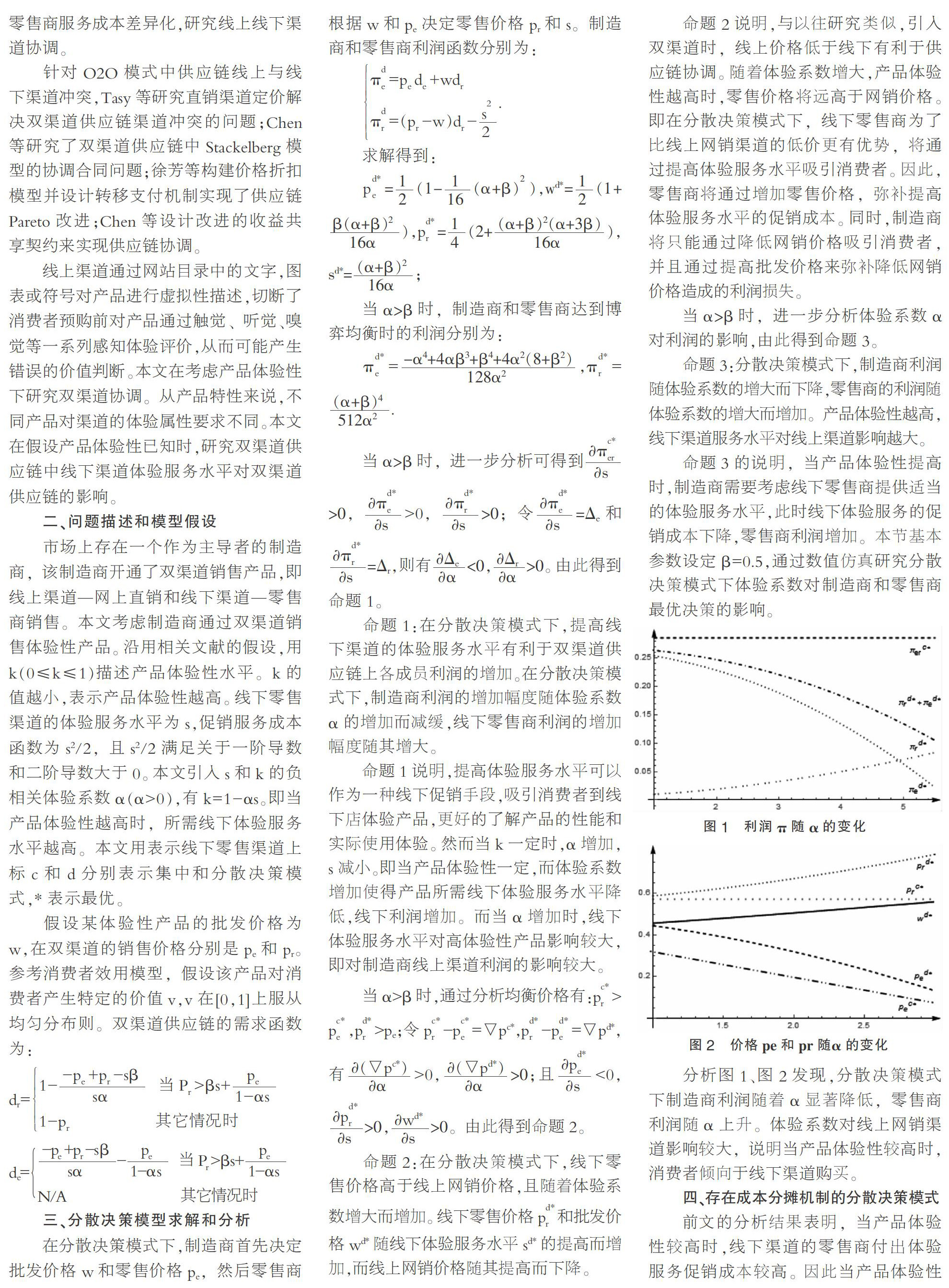 摘要:“新零售”的出现促使制造商考虑线下渠道的体验服务是否满足消费者对产品的体验需求。文章引入产品体验性与体验服务的负相关系数,构建并求解双渠道供应链模型中制造商和零售商的最优决策,并利用数值分析验证结论。研究表明,当产品体验性越高,线下渠道的体验服务对线上渠道影响越大。服务成本分摊机制在一定条件下实现了帕累托改进,且不会改变体验系数对供应链决策的影响。 关键词:双渠道供应链;产品体验性;体验服