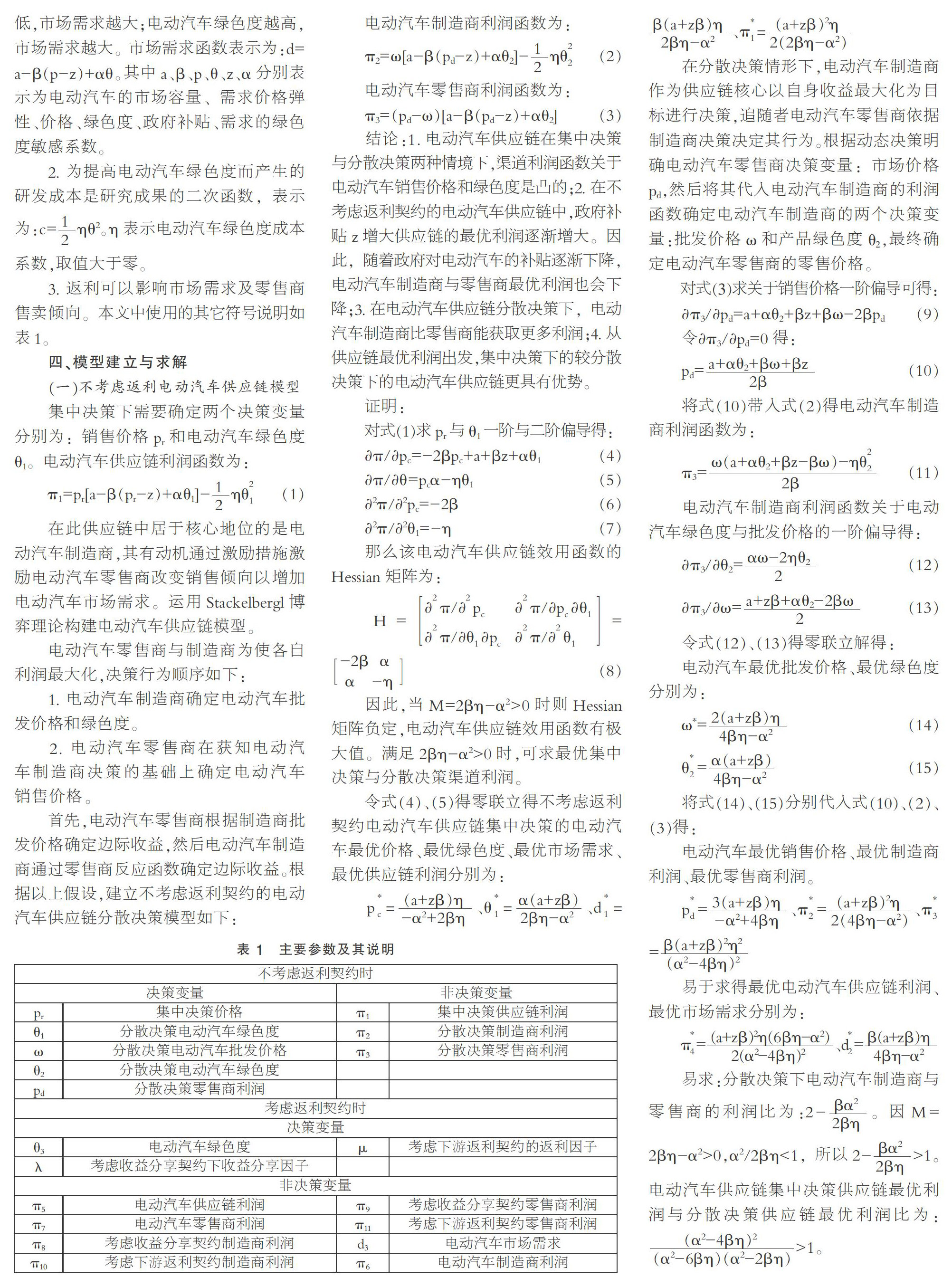 摘要:电动汽车相较于燃油汽车尚属于新兴产品,返利契约作为一种激励措施广泛存在于电动汽车供应链中。文章基于销售返利契约下电动汽车供应链协调策略问题,构建了不考虑返利契约情形下电动汽车供应链集中决策、分散决策模型以及基于返利契约的两种电动汽车决策模型。探讨了考虑电动汽车产品绿色度和电动汽车销售价格下销售返利契约对电动汽车供应链绩效的影响。两种基于返利契约的电动汽车供应链契约模型为:电动汽车制造商给