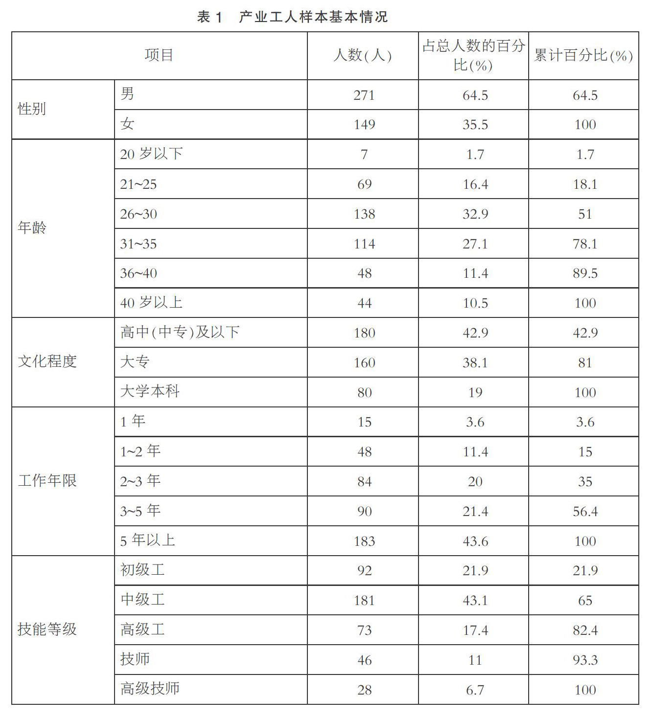 摘要:制造业产业工人的职业认同对产业工人队伍建设和推进制造业产业升级有着重要的意义。文章通过对420名制造业产业工人的问卷调查发现:制造业产业工人职业认同接近“比较认同”水平;不同产业工人个体的职业认同呈现出一定差异,其中由年龄、工作年限、教育程度和技能等级带来的水平差异较为显著。在此基础上,文章提出提升制造业产业工人职业认同的相关对策建议。 关键词:产业工人;职业认同;调查分析