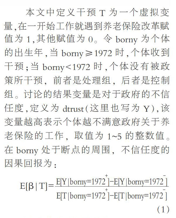 摘要:基于1991年的养老保险改革这个自然事件,采用2015年的中国综合调查数据(CGSS),利用断点回归设计方法来检验这一改革和政府信任度之间的因果关系。研究发现1991年的养老保险改革使得人们对于政府信任有些许下降,究其原因,可能是改革的阵痛和制度的剧变导致了信任度的下降。所以,政府在改革过程中除了关心经济效益,也要关心老百姓的评价,目前我国的经济模式也在向这个重心倾斜并取得了成功,兼顾效