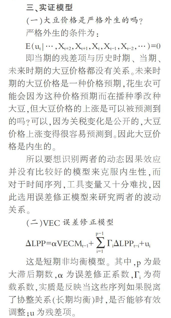 摘要:关税变动对大豆国内价格有重要影响,在此情况下,大豆的价格波动可能会传导至花生价格上。文章从实证的角度,通过邹检验验证突变,并构建VEC误差修正模型,在以中国对从国外进口的大豆加征关税这一节点为外生冲击的前提下,研究大豆价格和花生价格的关系。发现两者存在长期的均衡关系,并在短期存在正向关系;但大豆价格对花生价格的影响小于花生价格对自身的影响。基于以上结论,给予了相应的政策建议。 关键