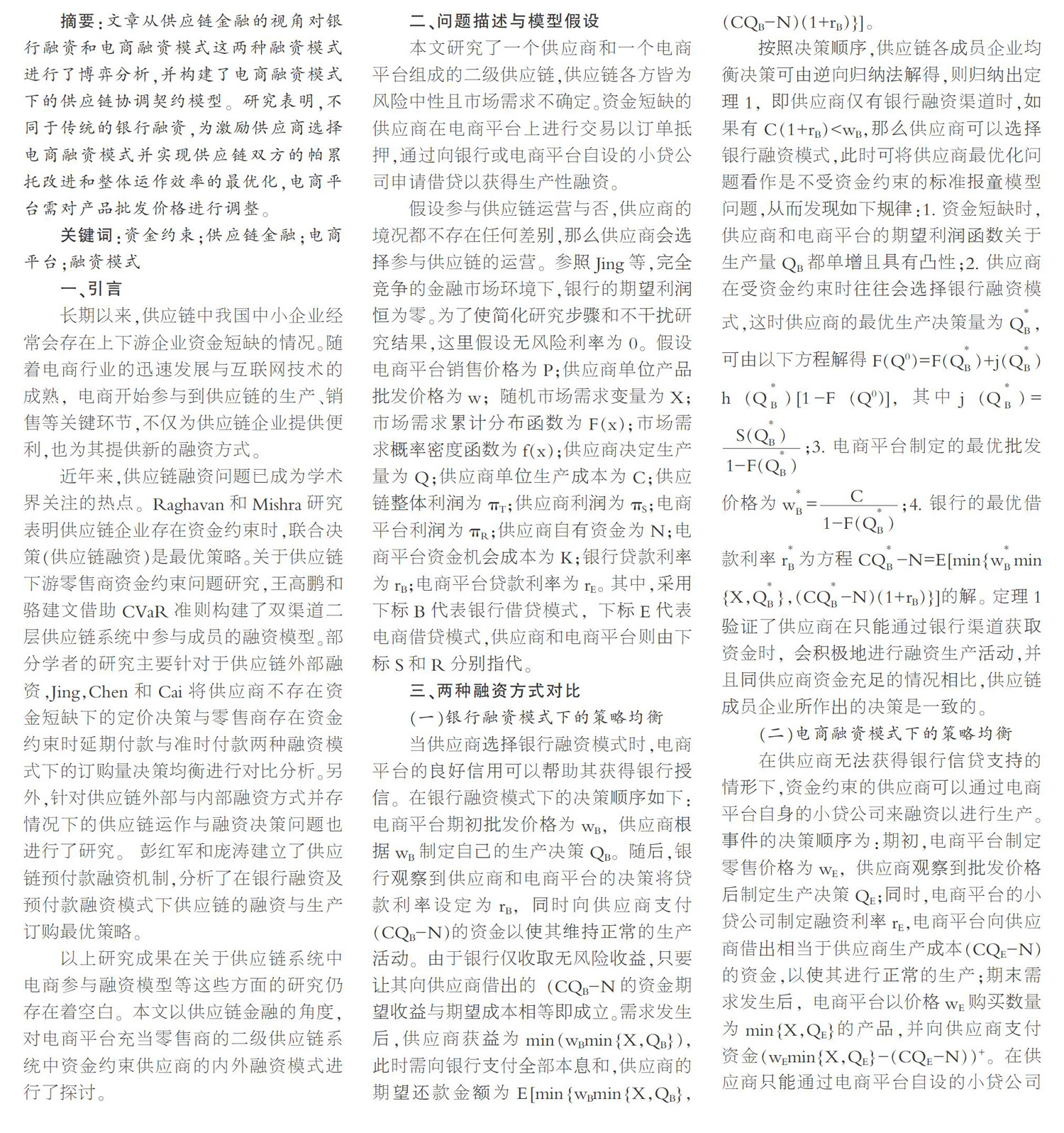 摘要:文章从供应链金融的视角对银行融资和电商融资模式这两种融资模式进行了博弈分析,并构建了电商融资模式下的供应链协调契约模型。研究表明,不同于传统的银行融资,为激励供应商选择电商融资模式并实现供应链双方的帕累托改进和整体运作效率的最优化,电商平台需对产品批发价格进行调整。 关键词:资金约束;供应链金融;电商平台;融资模式 一、引言 长期以来,供应链中我国中小企业经常会存在上下