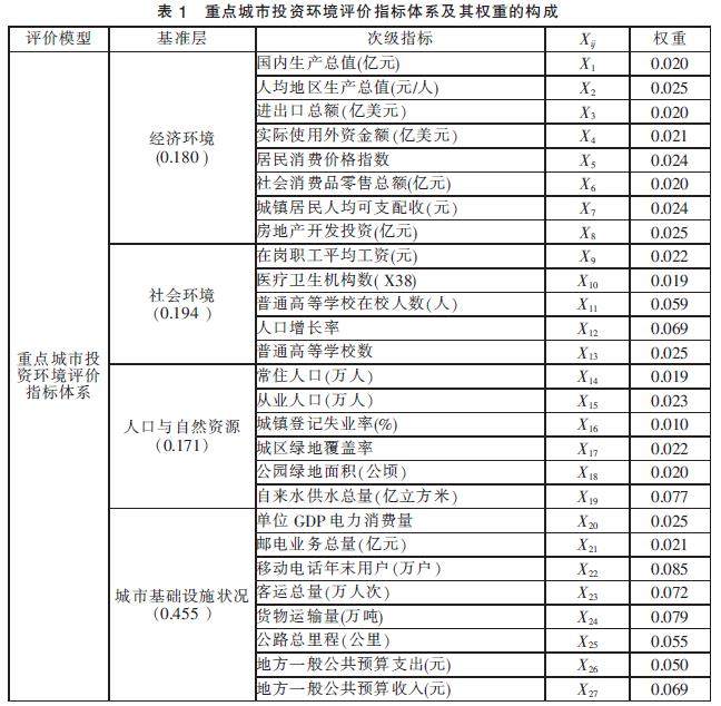 摘要:投资环境是一个国家和地区经济竞争力的重要体现,是市场、政府和社会相互作用的结果,是促进地区经济发展的重要推动因素。文章以全国重点城市为主要研究对象,从经济环境、社会环境、人力与自然资源环境、城市基础设施环境四个维度针对重点城市的投资环境建立了包含27个评价指标的评价指标体系,利用熵值法对我国重点城市的投资环境进行剖析和解读,据此从四个方面提出政策建议。 关键词:区域投资环境;熵值法