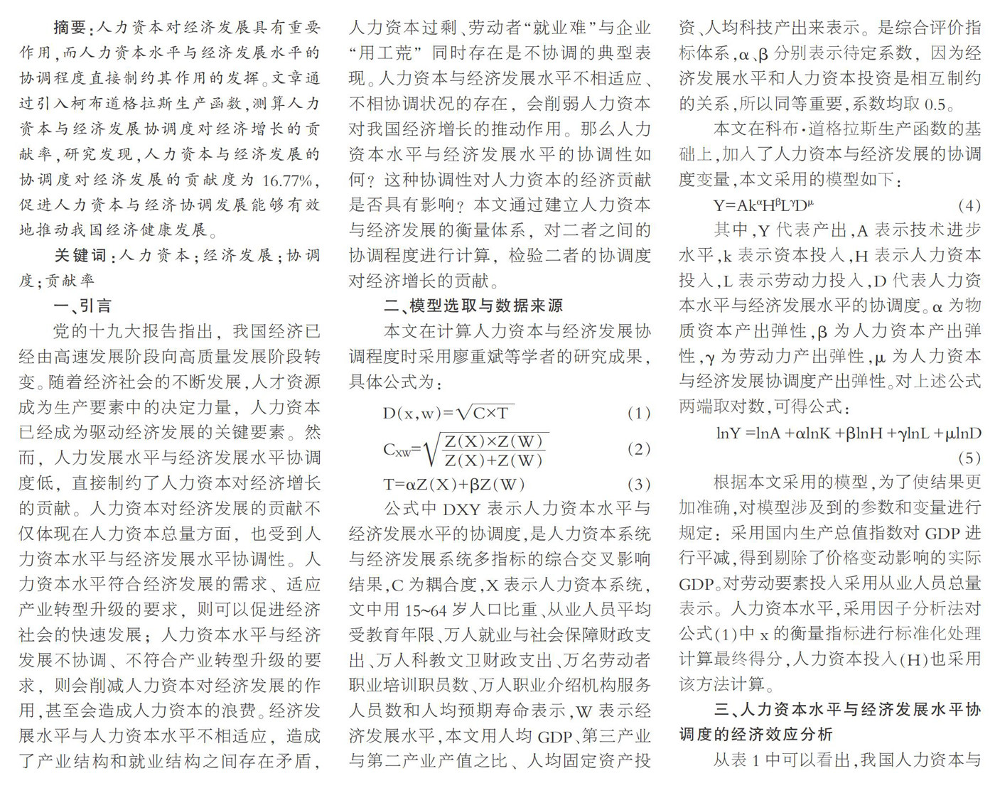 摘要:人力资本对经济发展具有重要作用,而人力资本水平与经济发展水平的协调程度直接制约其作用的发挥。文章通过引入柯布道格拉斯生产函数,测算人力资本与经济发展协调度对经济增长的贡献率,研究发现,人力资本与经济发展的协调度对经济发展的贡献度为16.77%,促进人力资本与经济协调发展能够有效地推动我国经济健康发展。 关键词:人力资本;经济发展;协调度;贡献率 一、引言 党的十九大报告指出,我国经济已