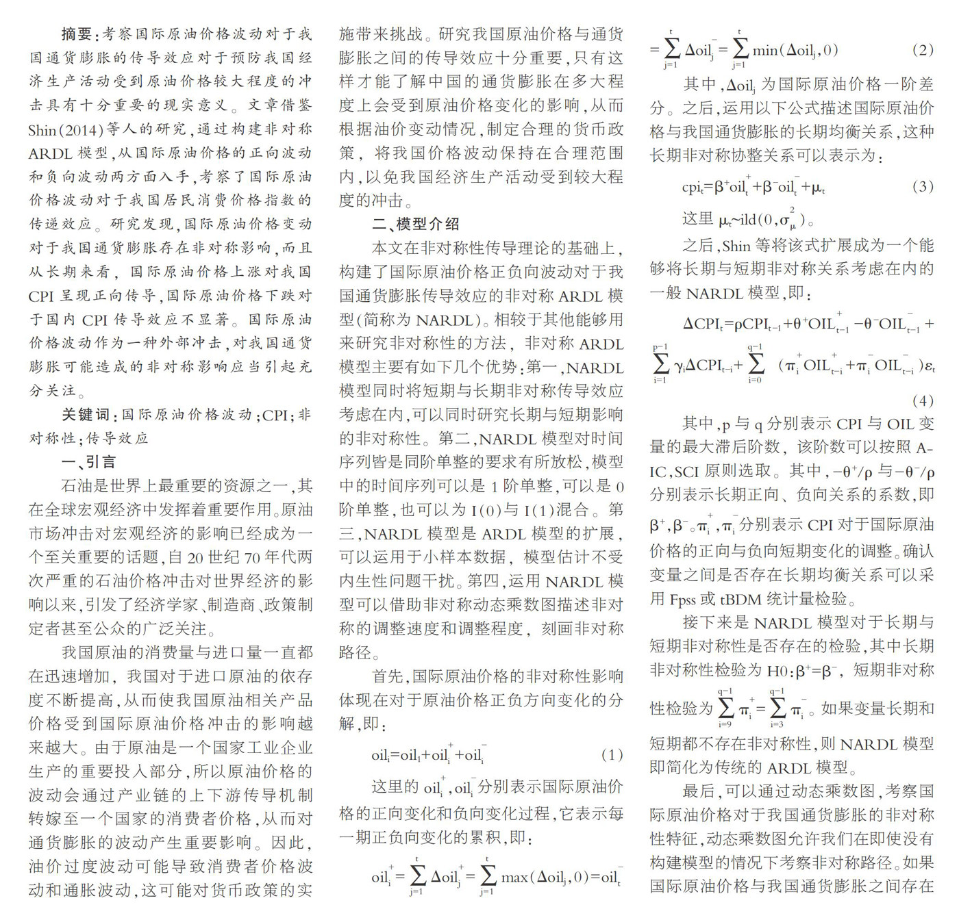 摘要:考察国际原油价格波动对于我国通货膨胀的传导效应对于预防我国经济生产活动受到原油价格较大程度的冲击具有十分重要的现实意义。文章借鉴Shin(2014)等人的研究,通过构建非对称ARDL模型,从国际原油价格的正向波动和负向波动两方面入手,考察了国际原油价格波动对于我国居民消费价格指数的传递效应。研究发现,国际原油价格变动对于我国通货膨胀存在非对称影响,而且从长期来看,国际原油价格上涨对我国C