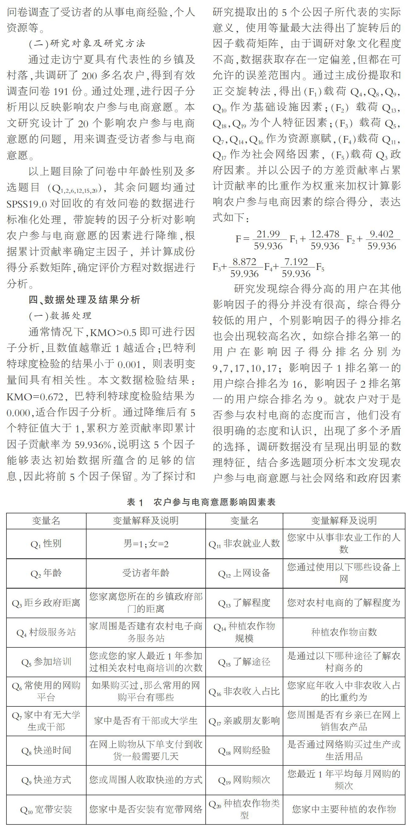 摘要:农村开展电子商务是实现精准扶贫、乡村振兴的重要渠道。文中选取宁夏部分地区作为调研对象,在分析宁夏电商发展现状的基础上,结合计划行为理论,通过问卷调查法收集有关数据,利用因子分析得出影响农户参与电商意愿的主要因素,并就现存问题进行分析并给出相关建议,以期增强农户参与电商意愿,加速宁夏农业现代化发展。 关键词:农村电商,计划行为理论,因子分析 一、引言 时值“十三五”收官之