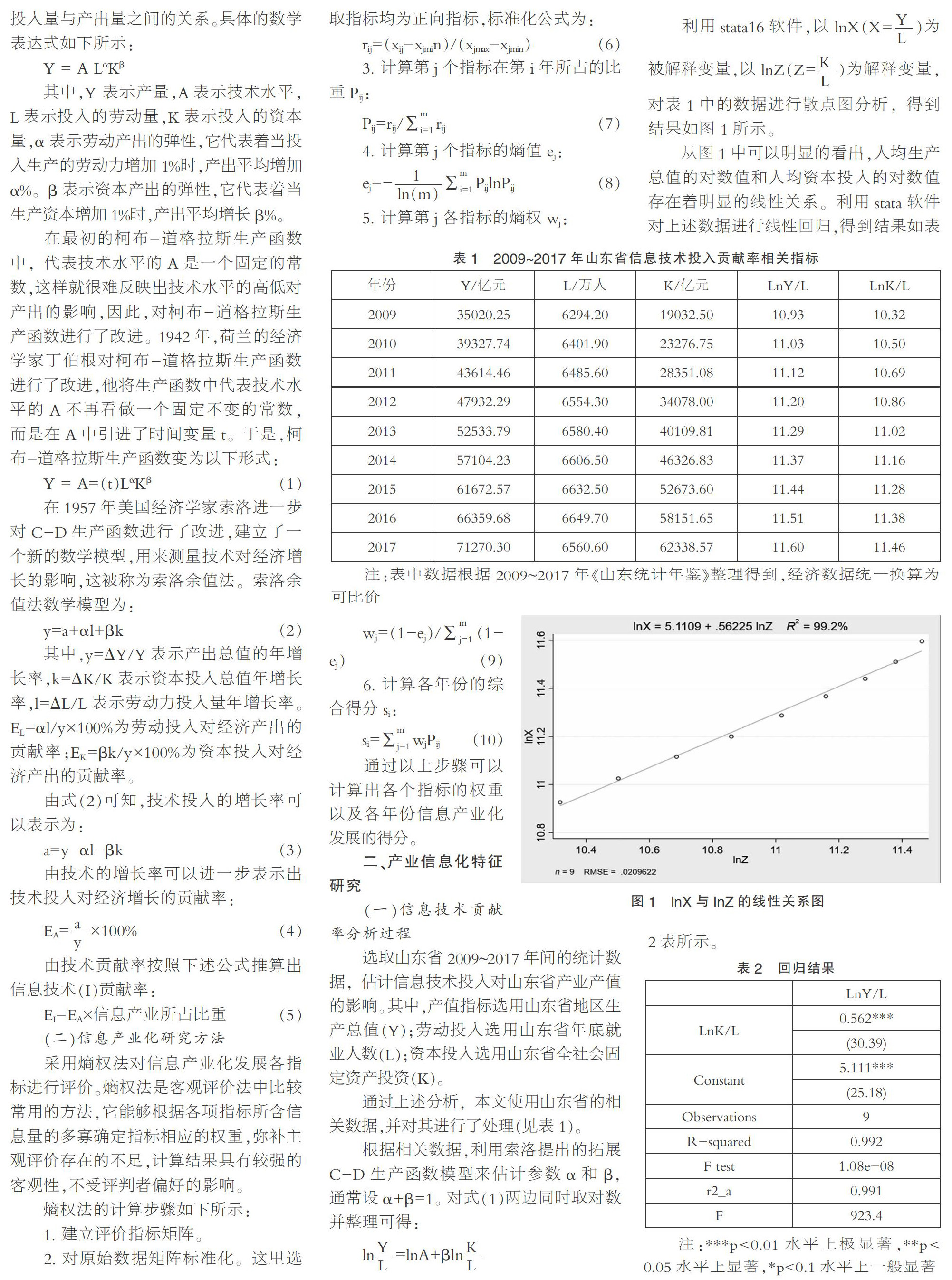 摘要:产业结构与信息化相互影响与促进。为分析山东省产业信息化与信息产业化并行发展特征,比较二者差异,找出发展着力点,提升产业结构与信息化融合发展水平,文章基于索洛余值法、熵权法、相关性分析,选取2009~2017年山东省经济总体数据与信息产业数据对信息化技术贡献率、信息产业综合得分以及产业信息化与信息产业化的相互关系加以分析,得到:山东省信息技术的贡献率呈现波动上升趋势,而信息产业综合得分呈现