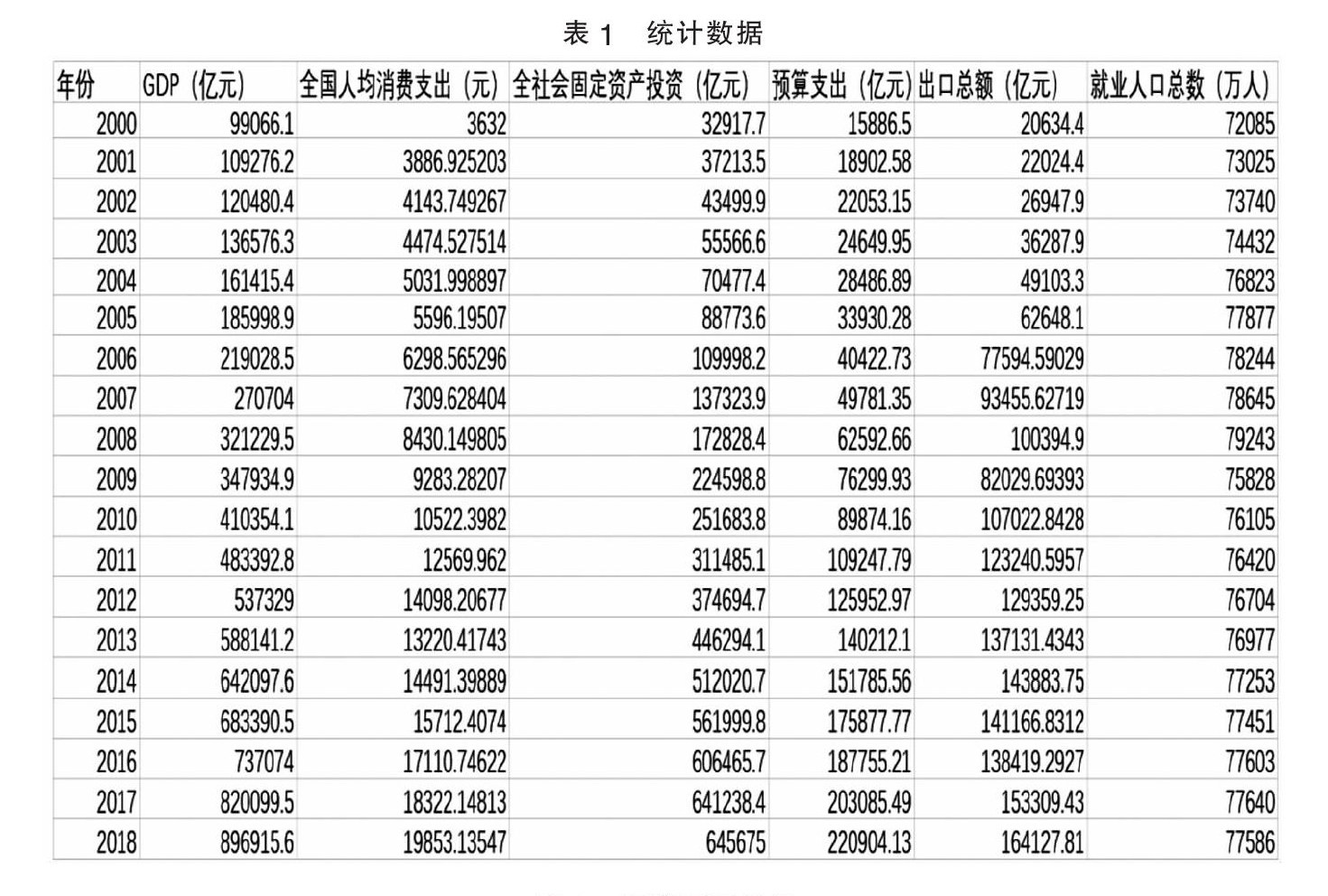 摘要:文章使用了自2000年到2018年共19年的统计数据进行计量分析,以国内生产总值作为被解释变量,全国居民人均消费支出、全社会固定资产投资、政府预算支出、出口贸易总额以及就业人口总数作为解释变量建立多元线性回归模型,并使用stata软件进行参数估计。最后文章对回归模型的经济意义进行了解释,同时依据该模型提出促进GDP进一步提高的政策建议。 关键词:国内生产总值;多元回归;影响因素