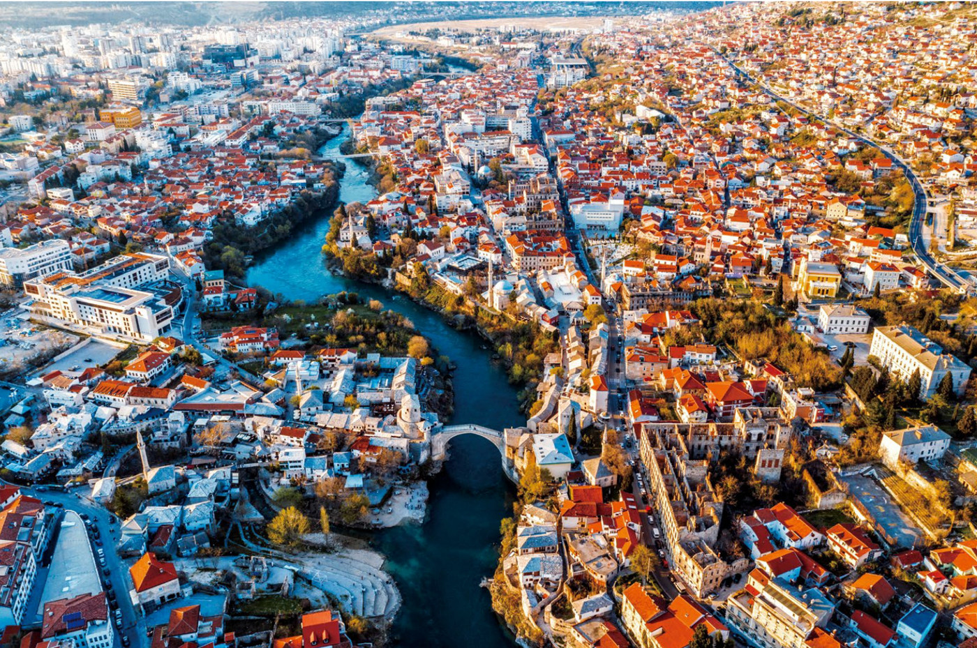 左页图为波黑南部上空俯瞰莫斯塔尔古城的风景,夕阳的余晖下,这座封印着千年历史的小镇变得鲜活起来;本页下图为战争后留下的建筑残骸,斑驳破碎的墙体上仍然蔓延着象征生命的绿意。 在波黑南部,内雷特瓦河如同一条流动的翡翠,贯穿莫斯塔尔。因此,就像波黑这个国家分为波斯尼亚和黑塞哥维那两个部分一样,莫斯塔尔也被河流划分成东西两半。 莫斯塔尔,历史上是黑塞哥维那的交通要塞,因此被