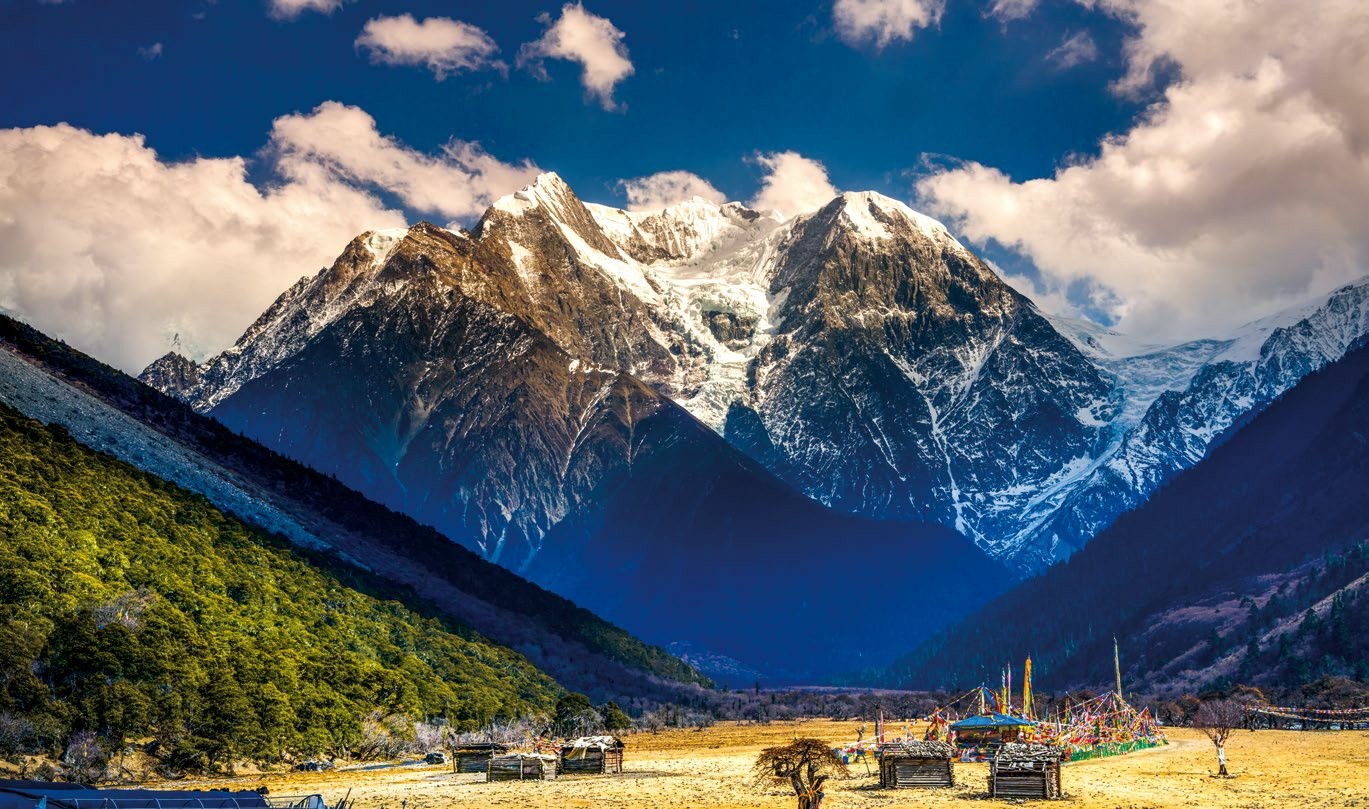 巍峨雄伟的梅里雪山,如天神一般屹立在横断的最深处,气势磅礴,左页图为从甲应村的视角看梅里雪山,右页图为“太子十三峰”里的五冠峰。 作为藏族人传统的祈福方式,转山近几十年来已广为人知,八大神山之首的梅里雪山,更是信仰藏传佛教的信徒一生必去朝觐的地方。从13世纪开始,围绕梅里的转山活动已经持续七百多年,亦成为世界上最经典的户外徒步路线之一。在雄伟的卡瓦格博脚下,足以使人清