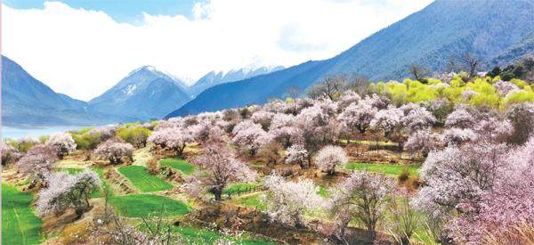 西藏林芝县嘎拉桃花村有一片天然野生桃林,当地人称桃花沟。桃花沟三面环山,高处有水源,四周林木葱茏,流水顺势而下,清澈见底。沟内野桃鳞次栉比,林间鸟雀欢鸣。每年3-4月间,雪山之下,漫山遍野的桃花绵延至河谷。粉红的桃花如醉霞绯云争相斗艳,与远方连绵的洁白雪峰、碧绿的青稞田、古朴的藏族民居、湾湾的河流,构成了仙境般的雪域桃源盛景,令人心旷神怡,流连忘返。图为2021年4月,林芝县嘎拉桃花村桃花沟盛景一