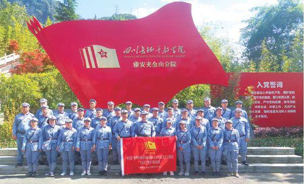 朗朗歌声,简短庄重的开班仪式后,在学院老师的带领和讲解下,学员们了解了雅安夹金山分院的整体情况及红军长征在雅安的革命历史。 在红军广场,陈双全代表全体学员敬献花篮,全体学员脱帽默哀,表达对革命烈士的深切缅怀和无限敬仰。同时,面对鲜艳的党旗,重温对党忠诚的誓言,进一步坚定理想信念,增强宗旨意识,永葆共产党员本色。 打草鞋、推磨子,做红军餐当午饭,深刻体会到了革命先烈的“苦”,回想现在生活中的“甜