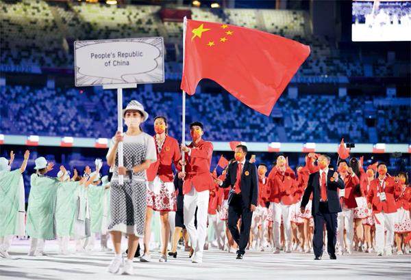 第32届夏季奥林匹克运动会开幕式上中国体育代表团入场。 7月23日晚,第32届夏季奥林匹克运动会在日本东京新国立竞技场开幕。开幕式上进行了文艺表演,并举行了升旗、运动员入场、宣誓等环节。国际奥委会主席巴赫、东京奥组委主席桥本圣子分别致辞。 “今天是充满希望的时刻。是的,这与我们所有人想象的都有所不同。但是让我们珍惜这个时刻,因为我们一起在这里:来自205个国家和地区的奥委会代表团,以及难民代表