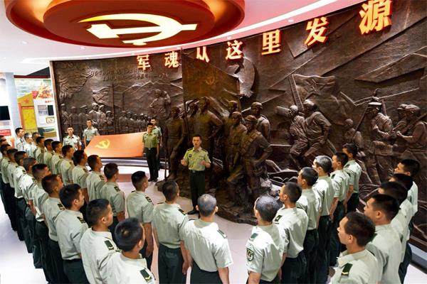 2021年7月4日,在陆军第83集团军某旅“红一连”连史馆“军魂从这里发源”雕塑前,指导员郑纪文(中)为官兵讲述“支部建在连上”的光荣历史。 三秦之地,华山脚下,驻守着一支战功卓著、声名赫赫的英雄连队。 走进这支连队的连史馆,一件件展品、一幅幅照片,铭刻着这支连队的厚重历史:“百战百胜”“英勇连”等一面面战旗,展示着连队取得的辉煌成绩;参与“三湾改编”、警卫遵义会议等历史事件,昭示着连队铁心向