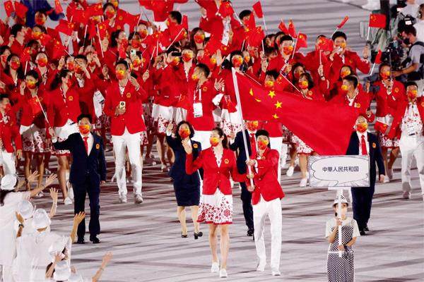 7月23日,第32届夏季奥林匹克运动会开幕式在日本东京新国立竞技场举行。图为中国体育代表团入场。(中新社记者 韩海丹 摄) 7月23日晚,第32届夏季奥林匹克运动会在日本东京新国立竞技体育场隆重开幕,这场四年一度的体育盛事,因为新冠肺炎疫情延期至2021年的夏天,但却并未降低全球观众的期待值。作为重头戏,东京奥运会开幕式悬念十足。大幕拉开之前的一波“路透”,瞬间就点燃了大洋彼岸的中国心,“开门红