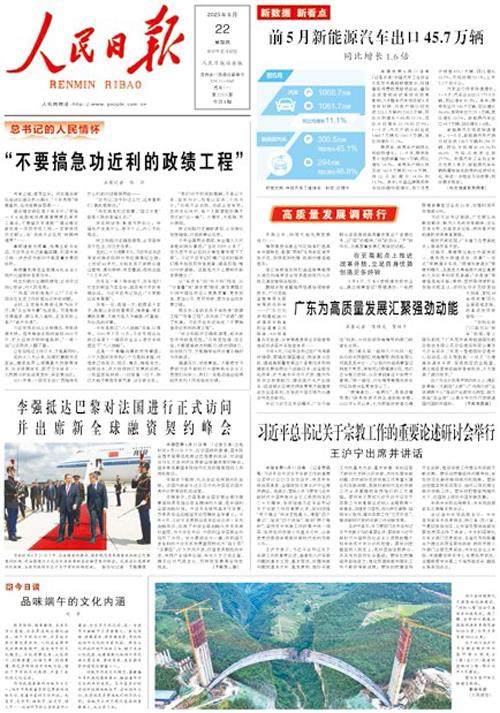 《人民日报》2023年5月17日第1版 长江浩荡,黄河奔腾,一部中华文明史,蘸着这江河水写就。 “要保持历史耐心和战略定力,一张蓝图绘到底,一茬接着一茬干,确保一江清水绵延后世、惠泽人民”“我们共产党人做事就是要为了全人类、为了子孙后代”……多次现场考察,多次主持座谈,习近平总书记为长江经济带发展、黄河流域生态保护和高质量发展思虑长远。 江河沿岸发生着令人感慨的变化:以前摩拳擦掌地搞开发、搞