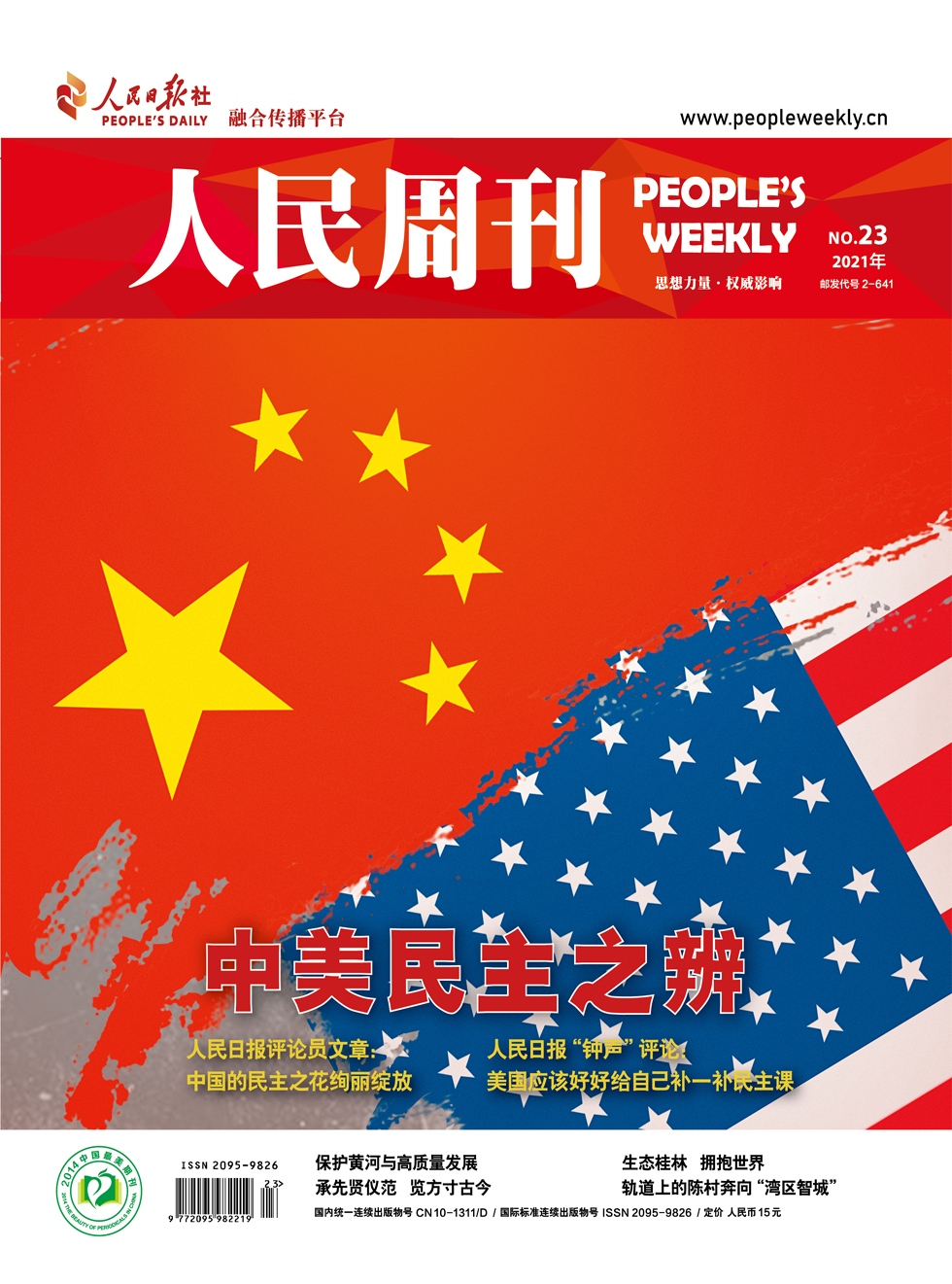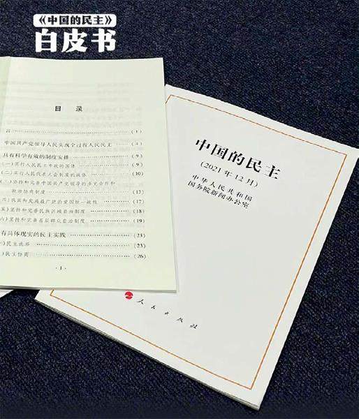编者按:2021年12月4日,国务院新闻办公室发表《中国的民主》白皮书;12月5日,外交部网站发布《美国民主情况》报告。本期《人民周刊》摘录《人民日报》刊发的部分重要文章及评论以飨读者。 12月4日,国务院新闻办公室发表《中国的民主》白皮书并举行新闻发布会。发布会上,有关部门负责同志就中国共产党领导人民实现全过程人民民主等方面内容作了解读。 坚持党的领导与发展全过程人民民主相互促进、相得益彰