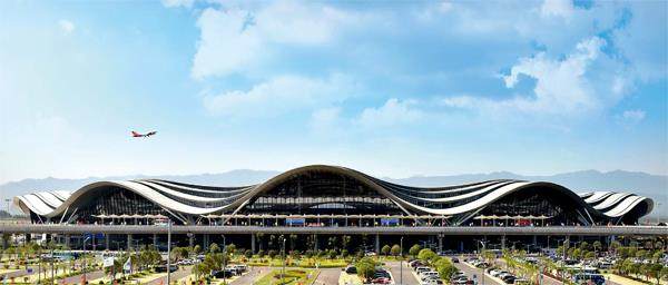 “国际范”的桂林两江国际机场T2航站楼,造型设计以桂林山水甲天下为灵感,山水般起伏流动的屋面线条和天际线构成一顶亮丽的“山水桂冠”,使机场与山水融为一体。(唐艳兰摄) 漓江是桂林山水之魂,是国家重点保护的13条江河之一,也是全球最美的15条河流之一,更是一张世界瞩目的“中国名片”。 2021年4月26日,习近平总书记来到桂林市象鼻山公园,远眺山水风貌,沿步道察看商业、邮政等服务设施。他指出,桂