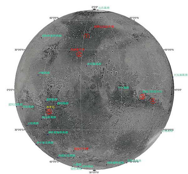 北京时间2月5日20时,“天问一号”探测器发动机点火工作,顺利完成地火转移段第四次轨道中途修正。此前,“天问一号”探测器在距离火星约220万公里处,获取了火星图像。这是我国拍摄的首幅火星图像。 “天问一号”拍摄的首幅火星图像。①阿茜达利亚平原;②克律塞平原;③子午高原;④斯基亚帕雷利坑;⑤水手谷。 “天问一号”拍摄的首幅火星图像。(图片来源:中新社)
