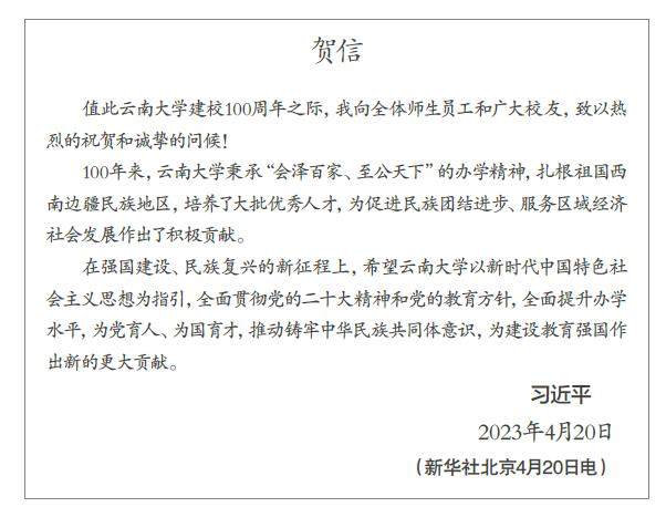 ·习近平致信祝贺云南大学建校100周年 中共中央总书记、国家主席、中央军委主席习近平4月20日致信祝贺云南大学建校100周年,向全体师生员工和广大校友致以热烈的祝贺和诚挚的问候。 ·习近平致电祝贺迪亚斯—卡内尔当选连任古巴国家主席 ·习近平主持召开二十届中央全面深化改革委员会第一次会议强调 守正创新真抓实干 在新征程上谱写改革开放新篇章 ·习近平向“中国式现代化
