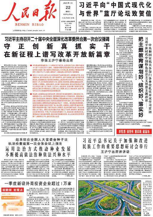 《人民日报》2023年4月22日第1版 ■ 今年是全面贯彻党的二十大精神的开局之年,也是改革开放45周年和党的十八届三中全会召开10周年。实现新时代新征程的目标任务,要把全面深化改革作为推进中国式现代化的根本动力,作为稳大局、应变局、开新局的重要抓手,把准方向、守正创新、真抓实干,在新征程上谱写改革开放新篇章 ■ 党的十八大以来,我们以巨大的政治勇气全面深化改革,坚持目标引领,突出问题导向,敢
